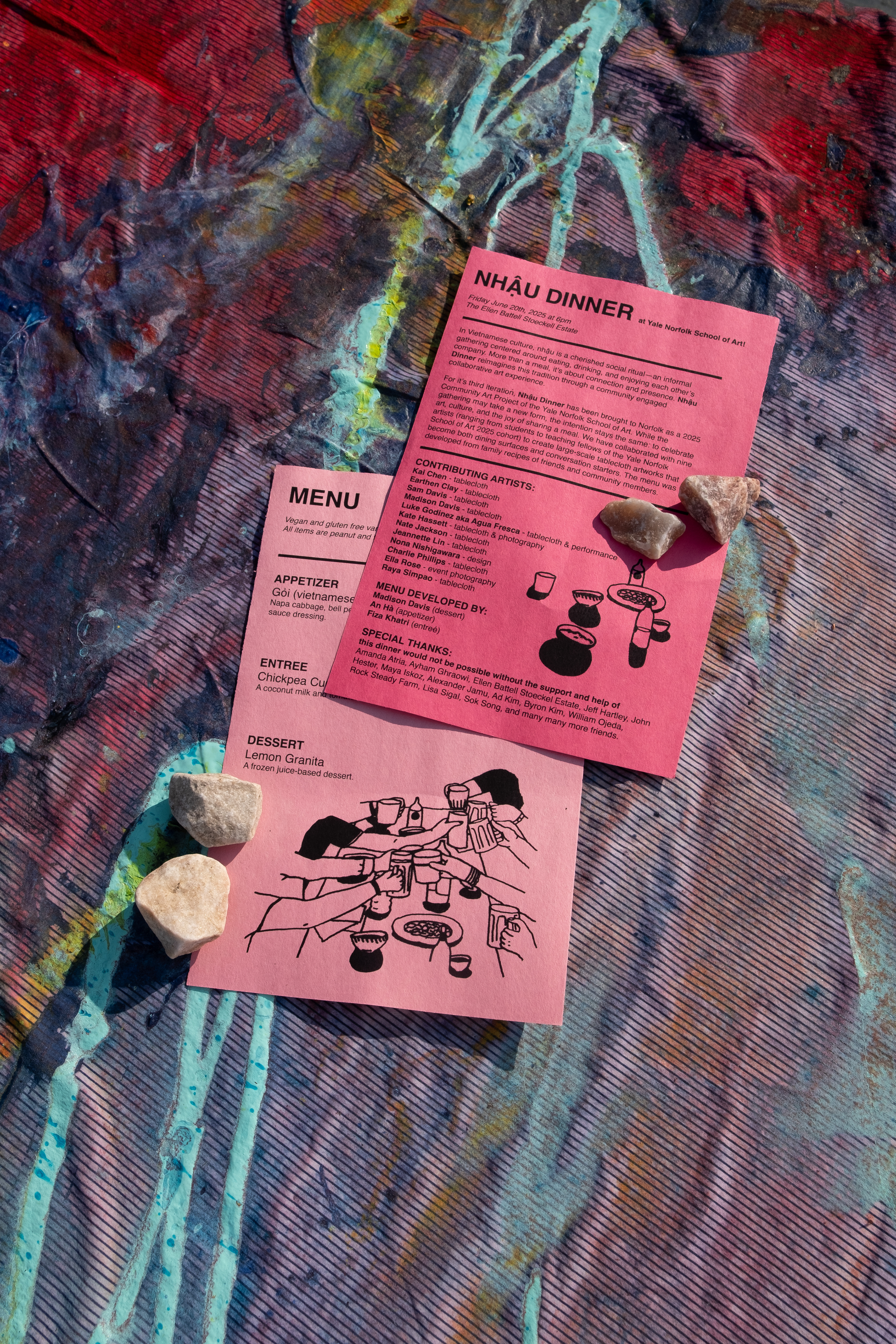 For it’s third iteration, Nhậu Dinner has been brought to Norfolk as a 2025 Community Art Project of the Yale Norfolk School of Art. While the gathering may take a new form, the intention stays the same: to celebrate art, culture, and the joy of sharing a meal. We have collaborated with nine artists (ranging from students to teaching fellows of the Yale Norfolk School of Art 2025 cohort) to create large-scale tablecloth artworks that become both dining surfaces and conversation starters for 75 participants. The menu was developed from family recipes of friends and community members.