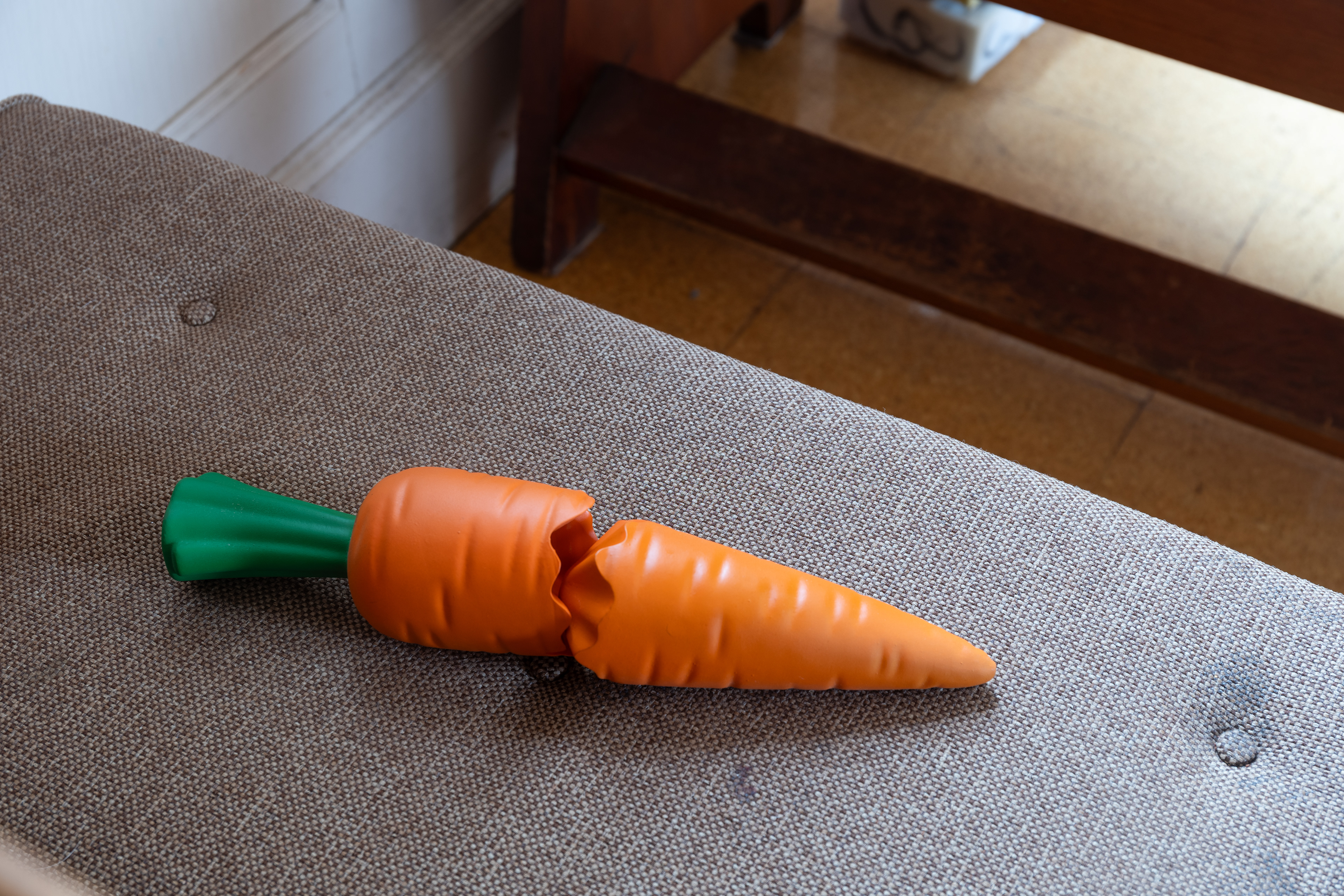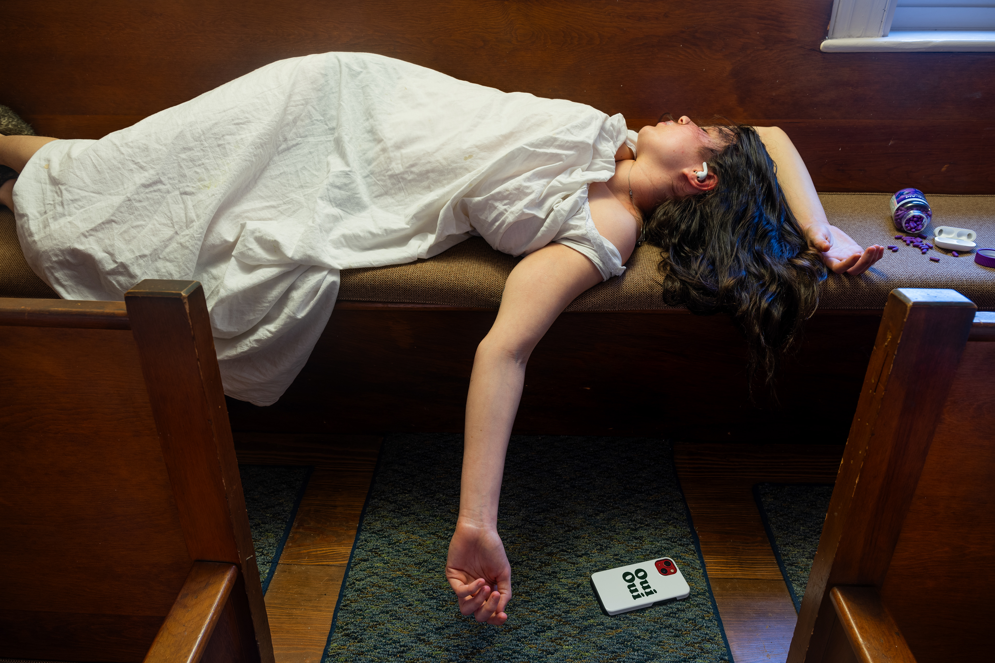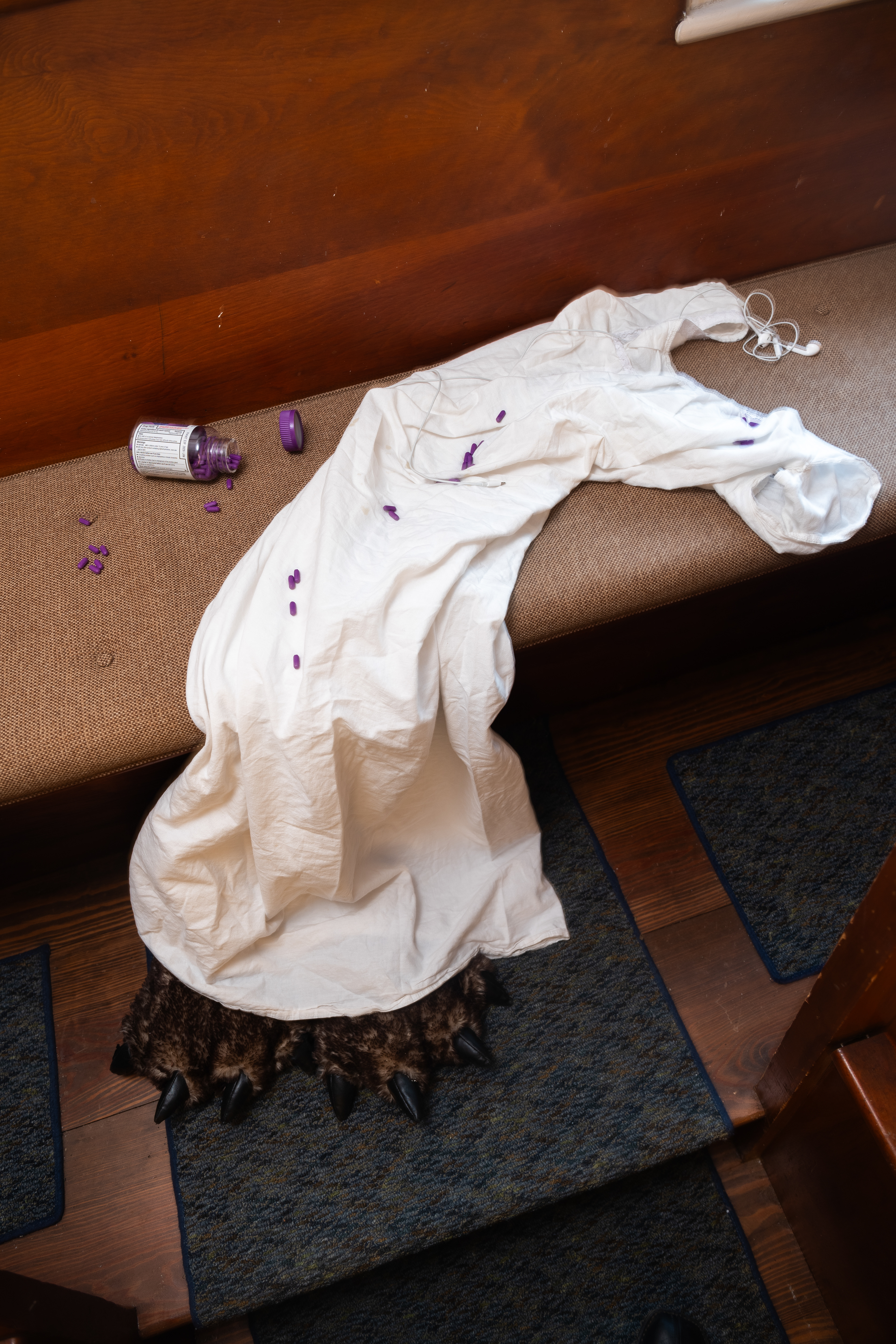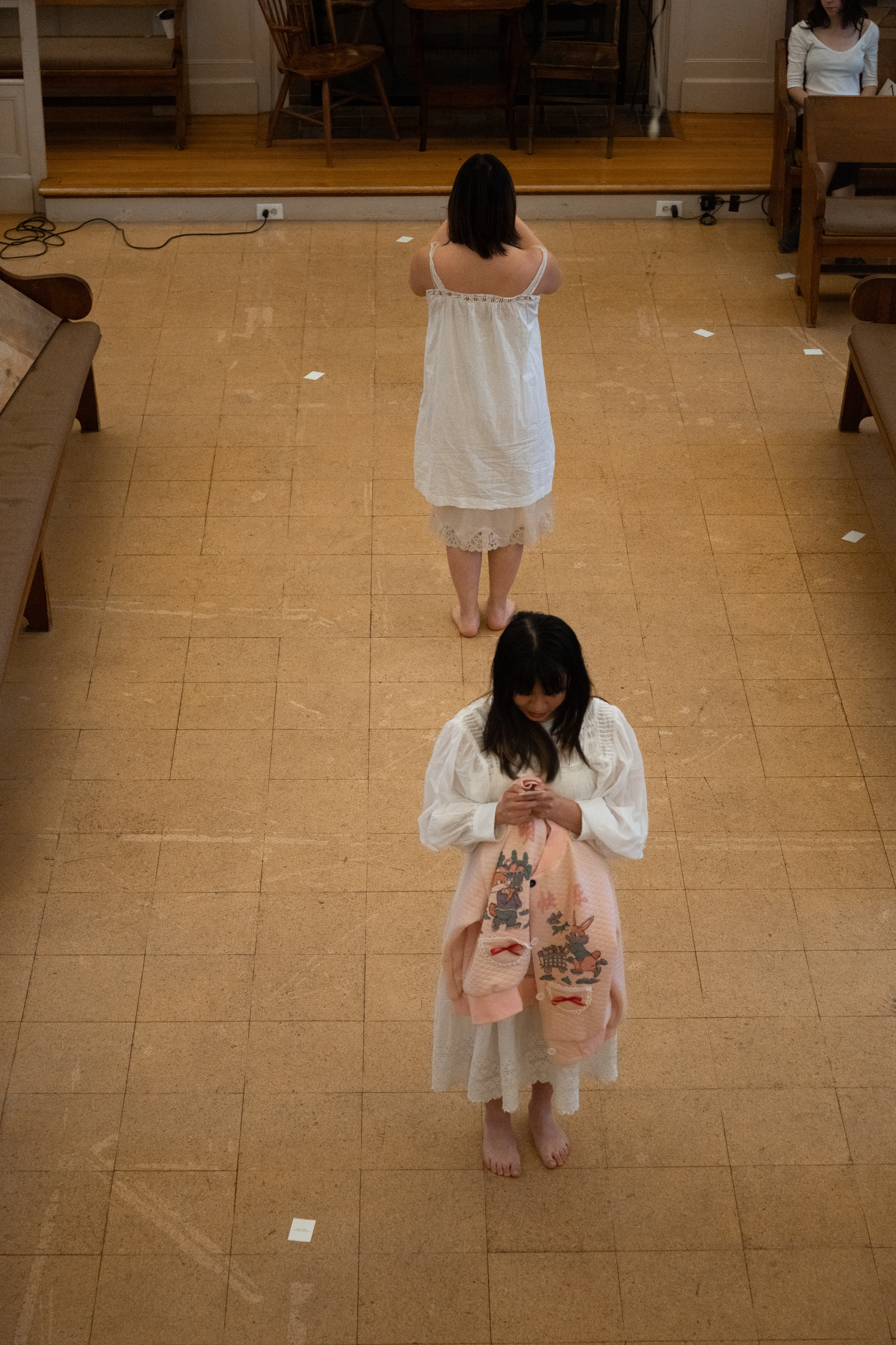 The group exhibition disorients the perceived passiveness of objects and softens the active agencies of human bodies. The hello-kitty ceramics (name’s Mellow Kitty) lying squarely on a pew, listen attentively with pleasant smiles, whereas the monkey doll (Moli Ma’s You are in the Body of a Human Girl) sitting on top of a window frame secretly observes and mischievously greets our presence. An Hà’s works with found and discarded objects meditate on the absence of their human figure counterparts: in Untitled (Just One More), a cigarette lights on its own periodically on a coffee cup marked with stains, and in Breathing, a brown paper bag softly expands and contracts while making a ghostly rustling sound. Ivy Lockhart’s reception, a durational performance score of her sleeping in a white gown and animal costume slippers with sleep aid pills spilled over next to her, generates quiet intimacy that obscures the boundary between dormancy and aliveness. These myriad soft encounters between humans and nonhumans somehow formulate a residual sense of life that is not yet lively, not yet awakened, and not yet fully recognized.