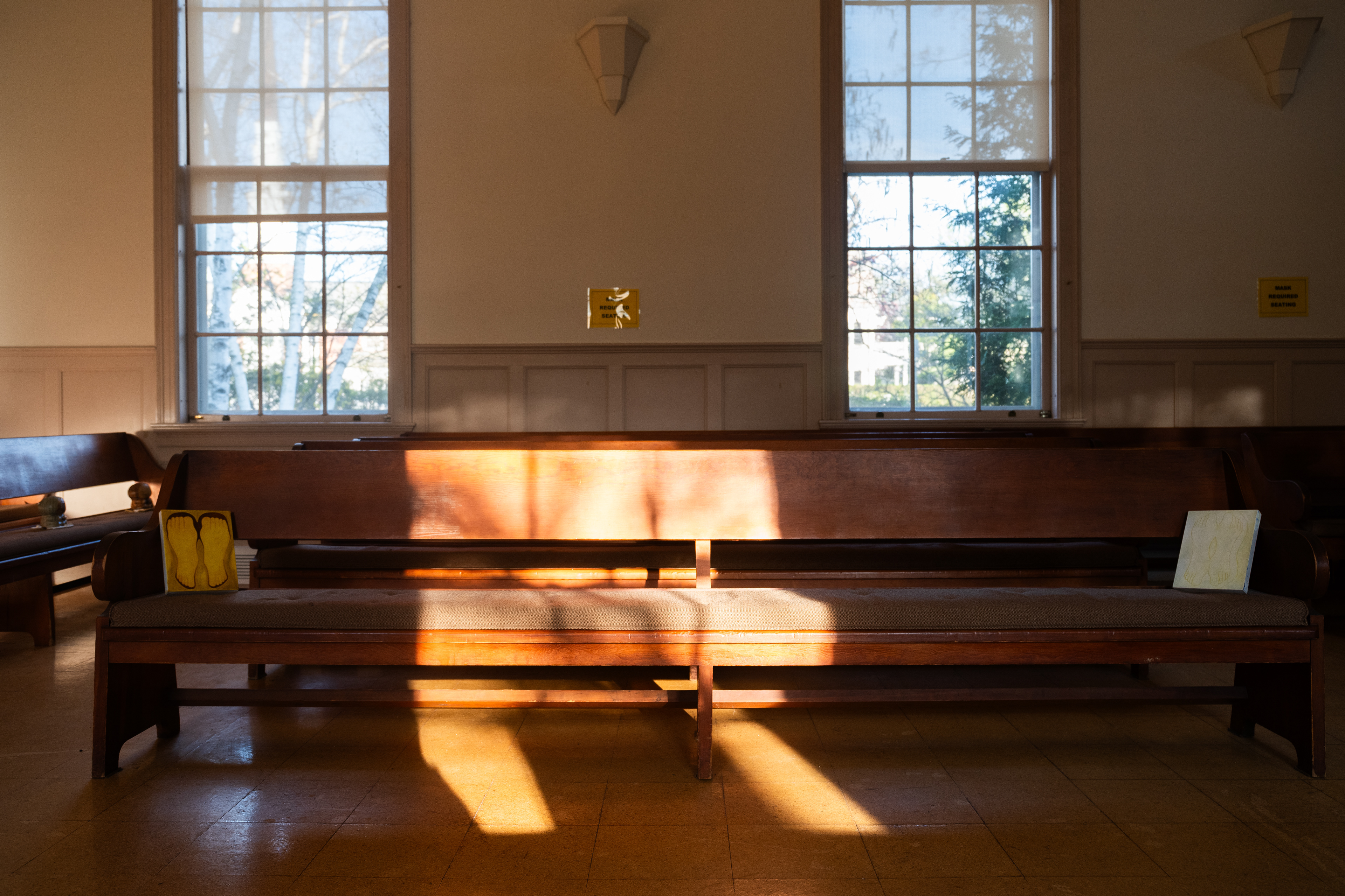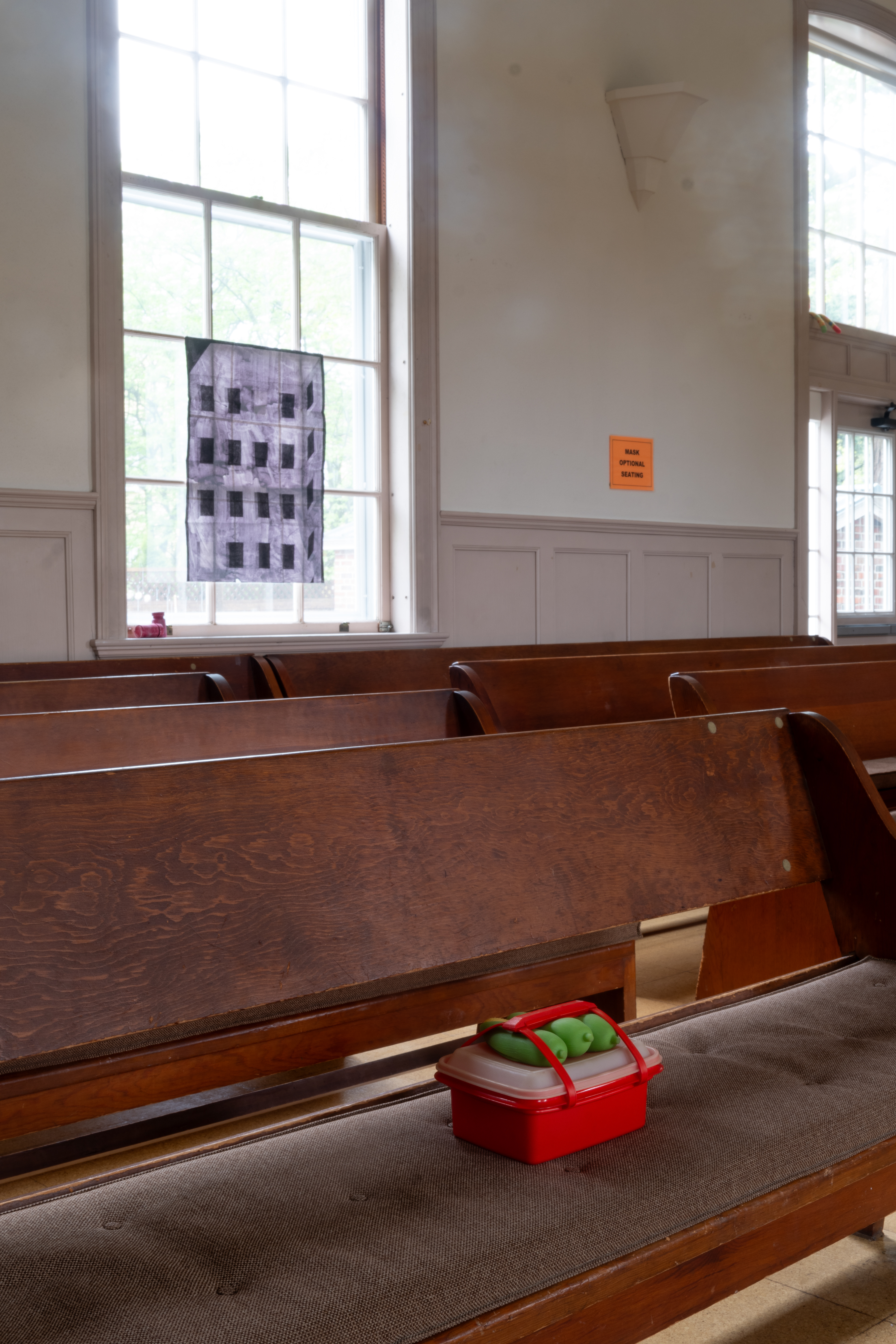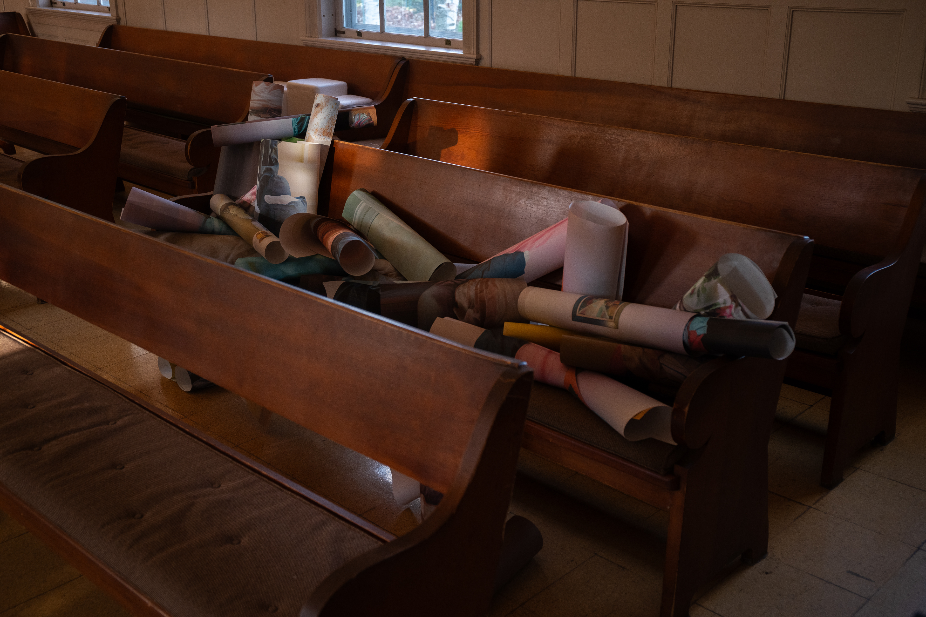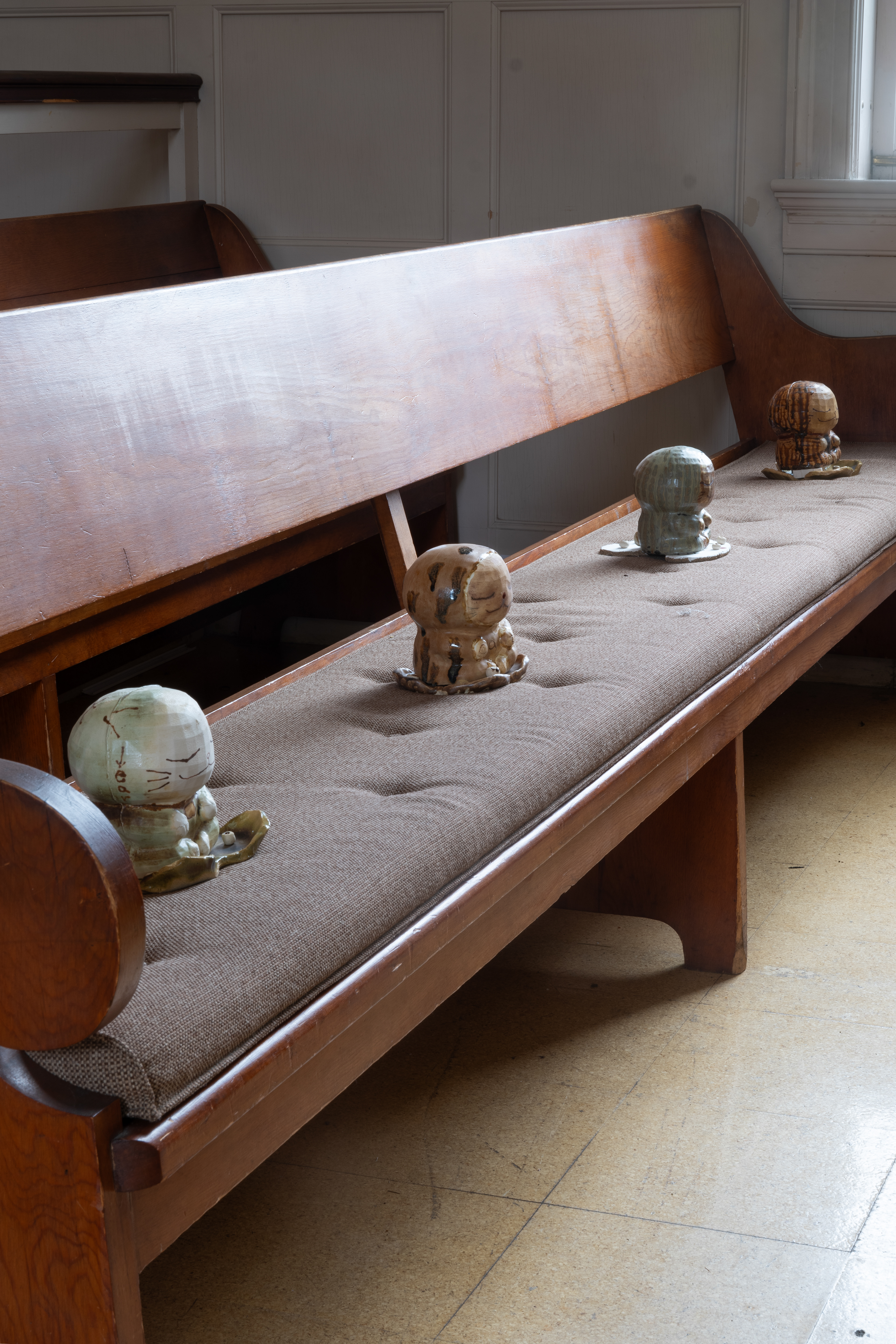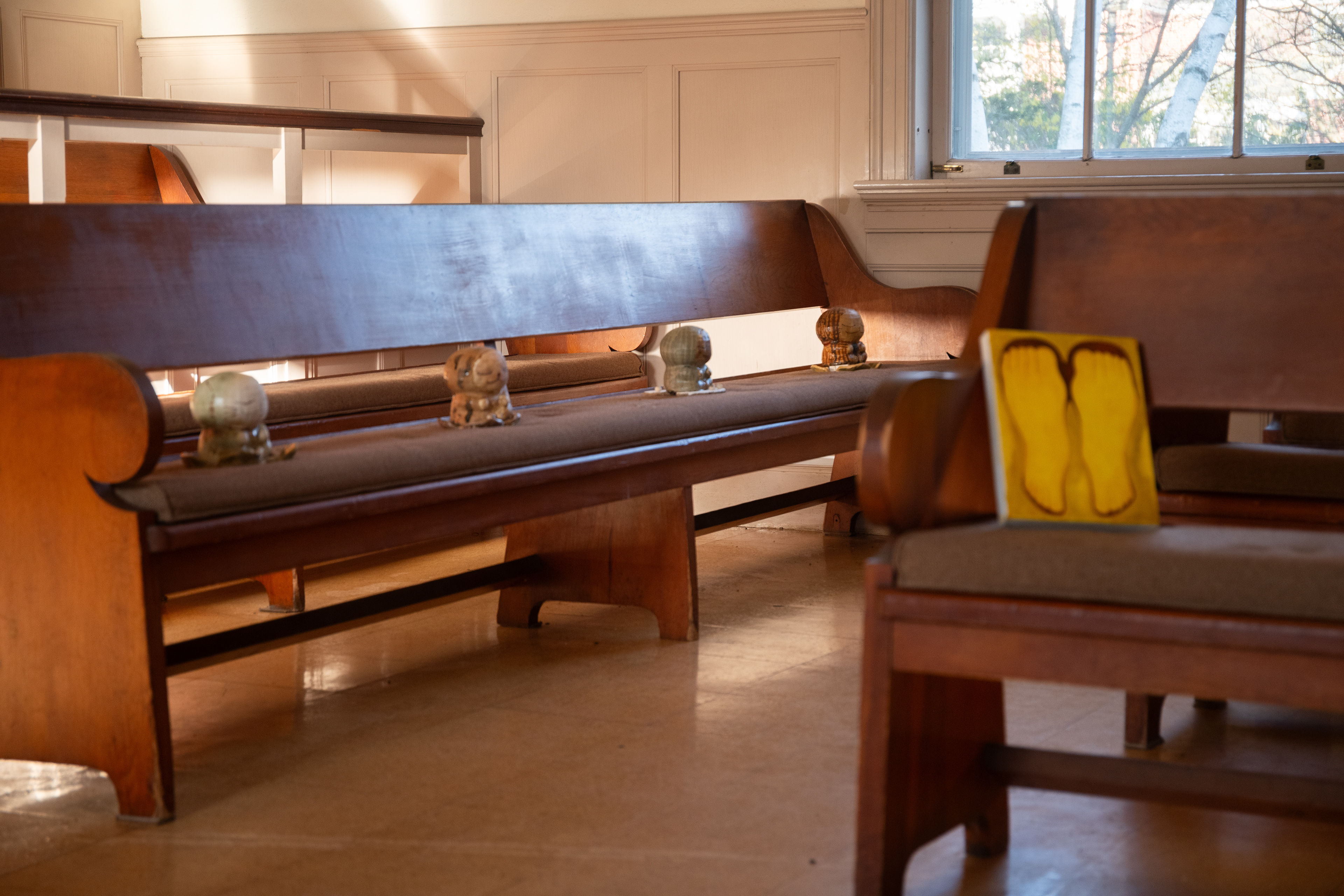 On a drizzling Saturday afternoon, Friends Meeting at Cambridge is inhabited with new beings. In between the orderly arranged pews lie a variety of objects, from glazed ceramics and painting scrolls to seemingly insignificant items like found dolls and styrofoam coolers, each of which are invited to breathe with new air and animatedness. As I entered this Quaker’s gathering place on the outskirts of Harvard Square, I was first enthralled by the expansiveness of the two-story church, with light-filled windows and views of greenery outside. I was then quickly surprised by how the curated objects inhabit a much more minor scale, with some hidden underneath or behind the benches. I was greeted by the curators / artists An Hà and Vivian Tran who offered me a program (a map with exhibited objects and where they are located) and encouraged me to explore the entirety of the meeting house. I followed my instinct to sit down and become closer to, or even a part of, this unlikely gathering, in the quiet, in the stillness, along with the gentle soundscape of the rain.