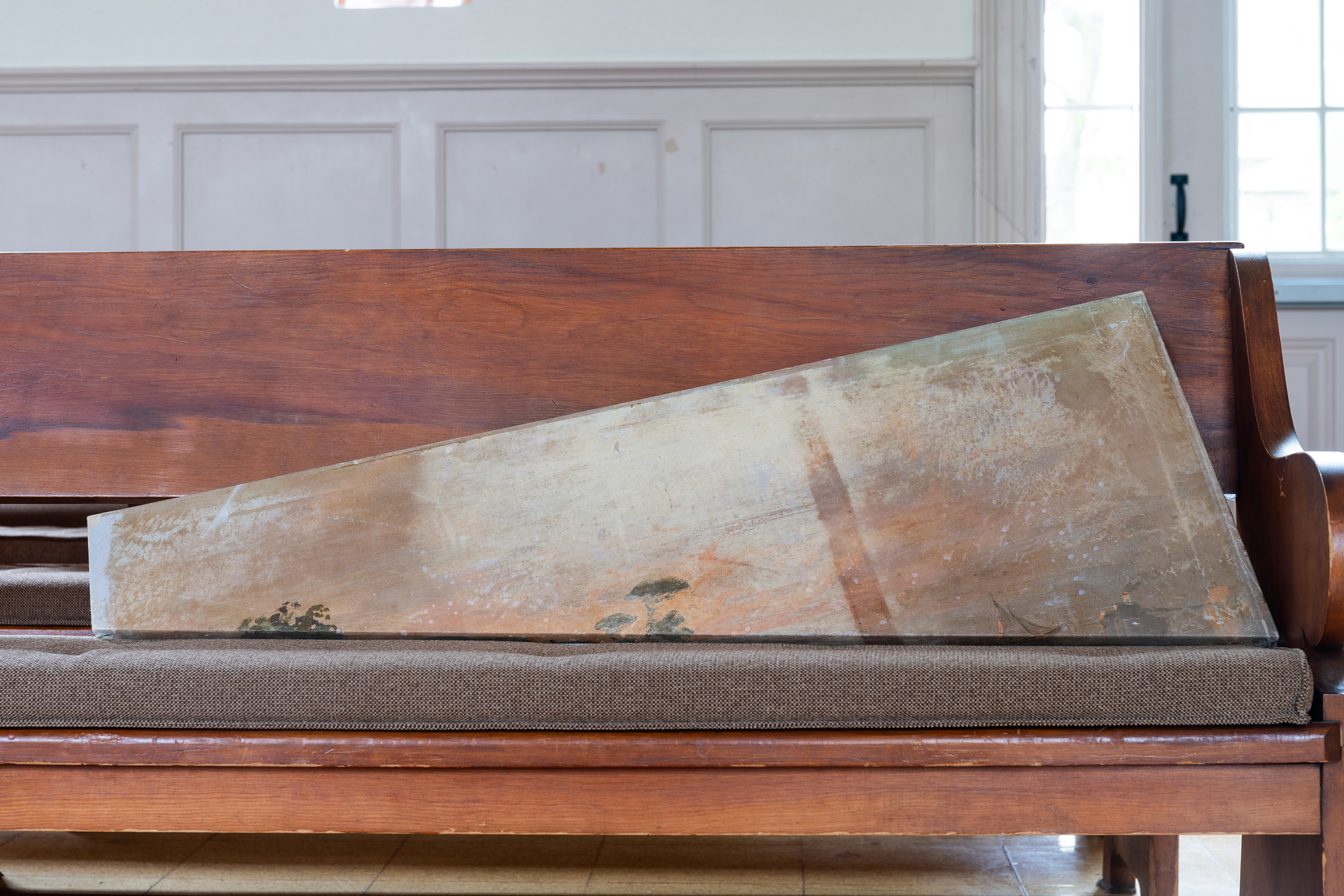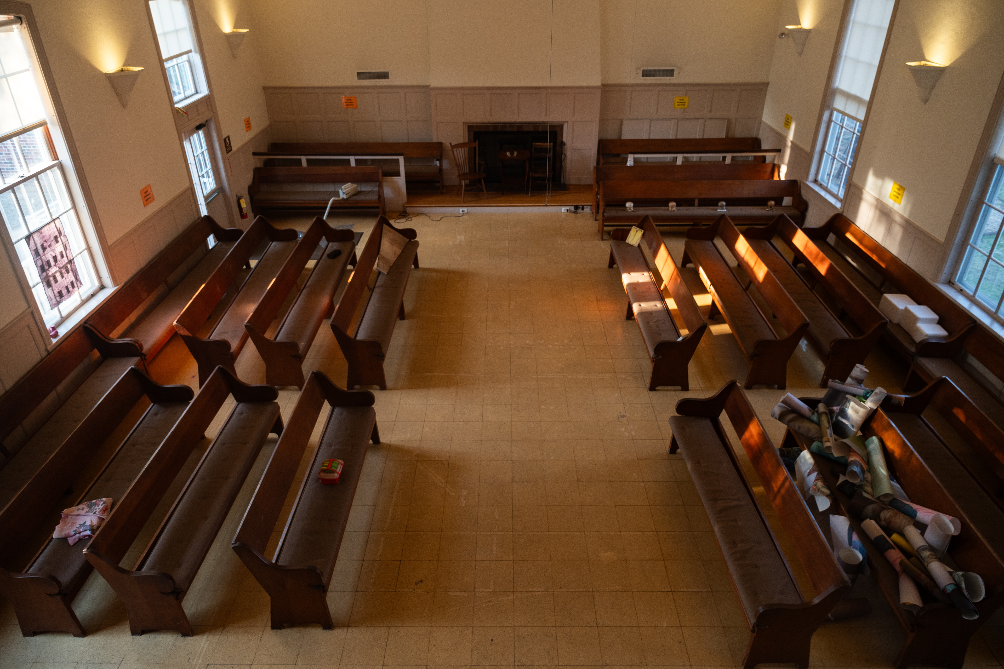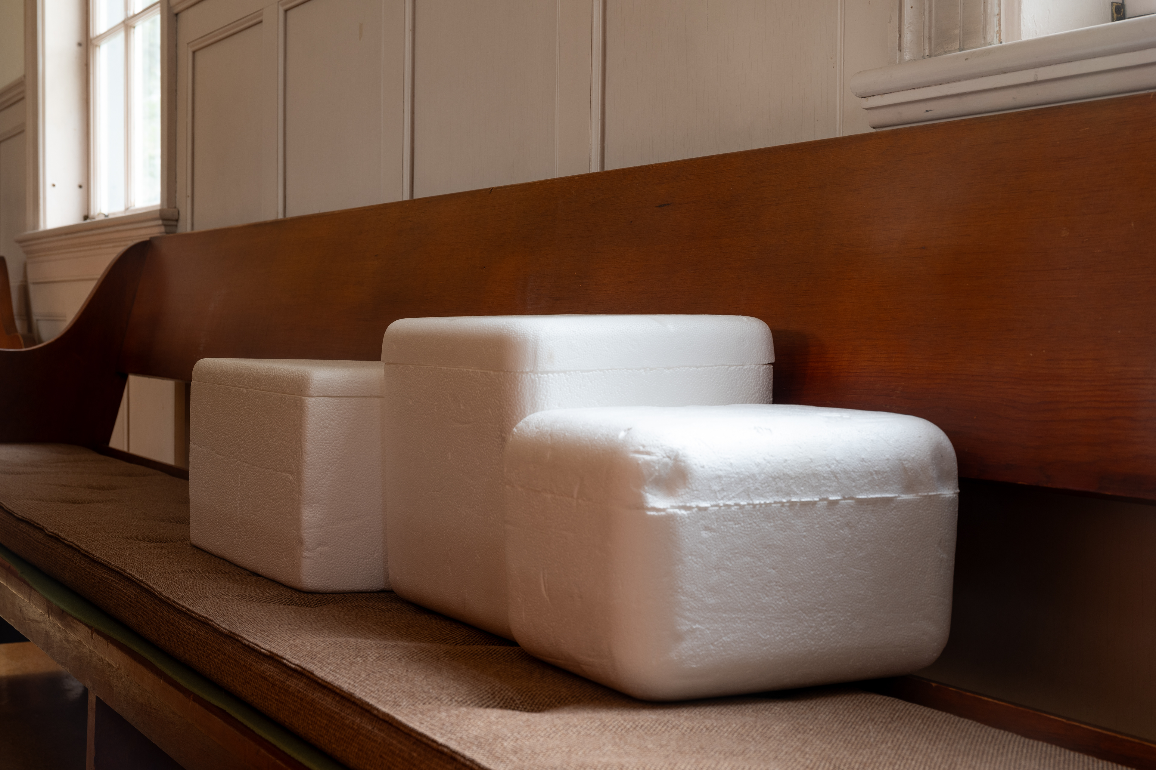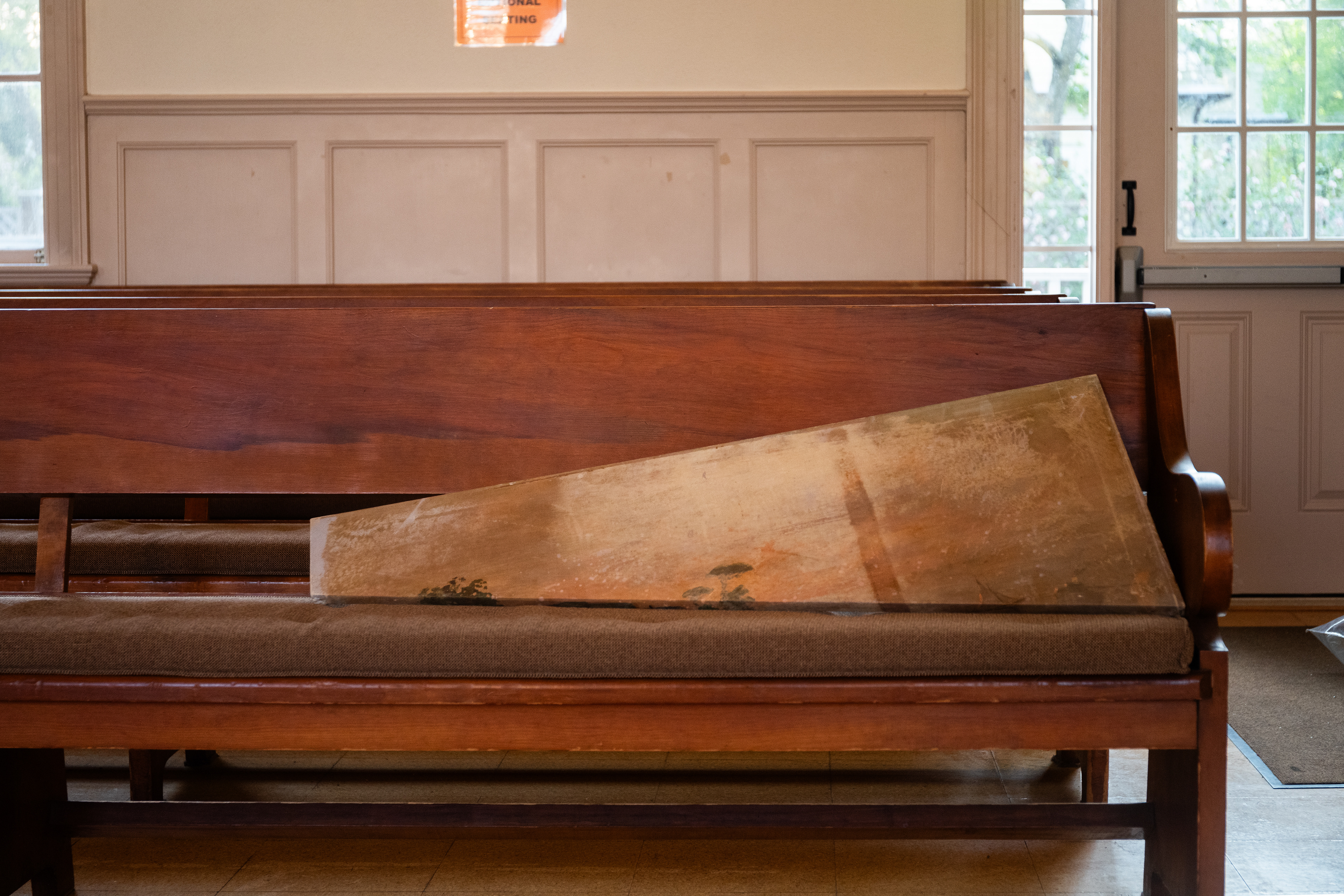 On a drizzling Saturday afternoon, Friends Meeting at Cambridge is inhabited with new beings. In between the orderly arranged pews lie a variety of objects, from glazed ceramics and painting scrolls to seemingly insignificant items like found dolls and styrofoam coolers, each of which are invited to breathe with new air and animatedness. As I entered this Quaker’s gathering place on the outskirts of Harvard Square, I was first enthralled by the expansiveness of the two-story church, with light-filled windows and views of greenery outside. I was then quickly surprised by how the curated objects inhabit a much more minor scale, with some hidden underneath or behind the benches. I was greeted by the curators / artists An Hà and Vivian Tran who offered me a program (a map with exhibited objects and where they are located) and encouraged me to explore the entirety of the meeting house. I followed my instinct to sit down and become closer to, or even a part of, this unlikely gathering, in the quiet, in the stillness, along with the gentle soundscape of the rain.