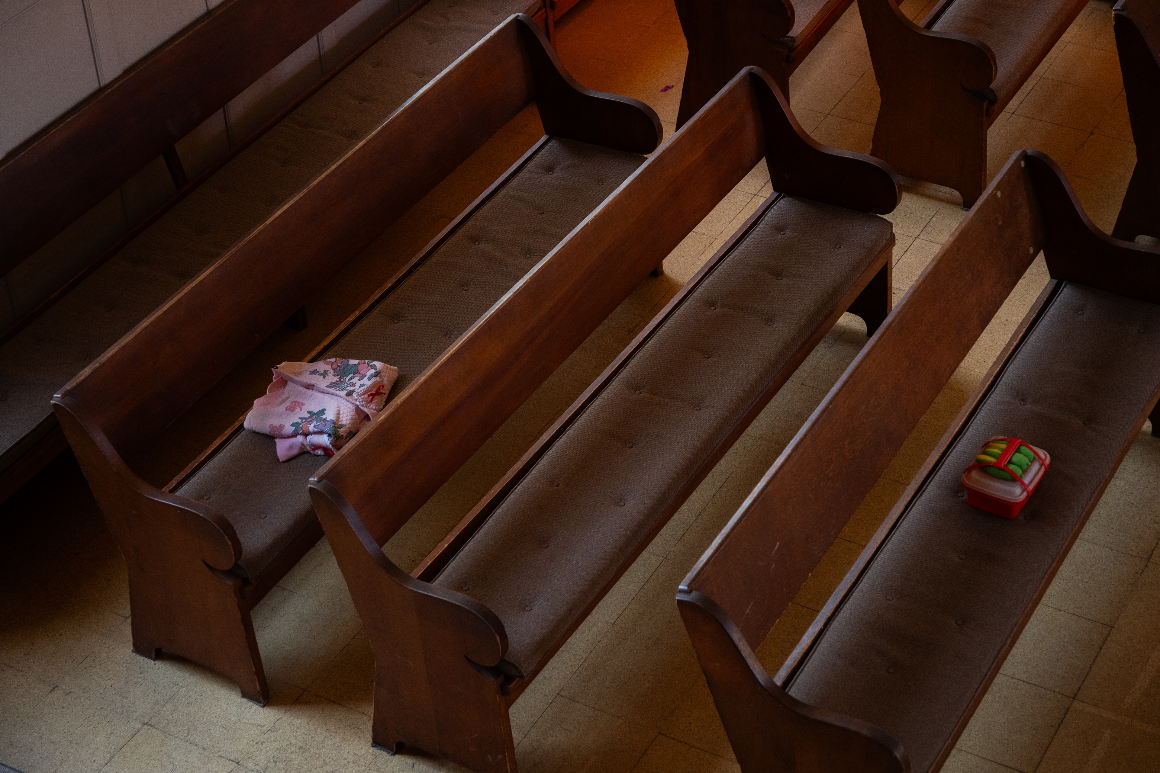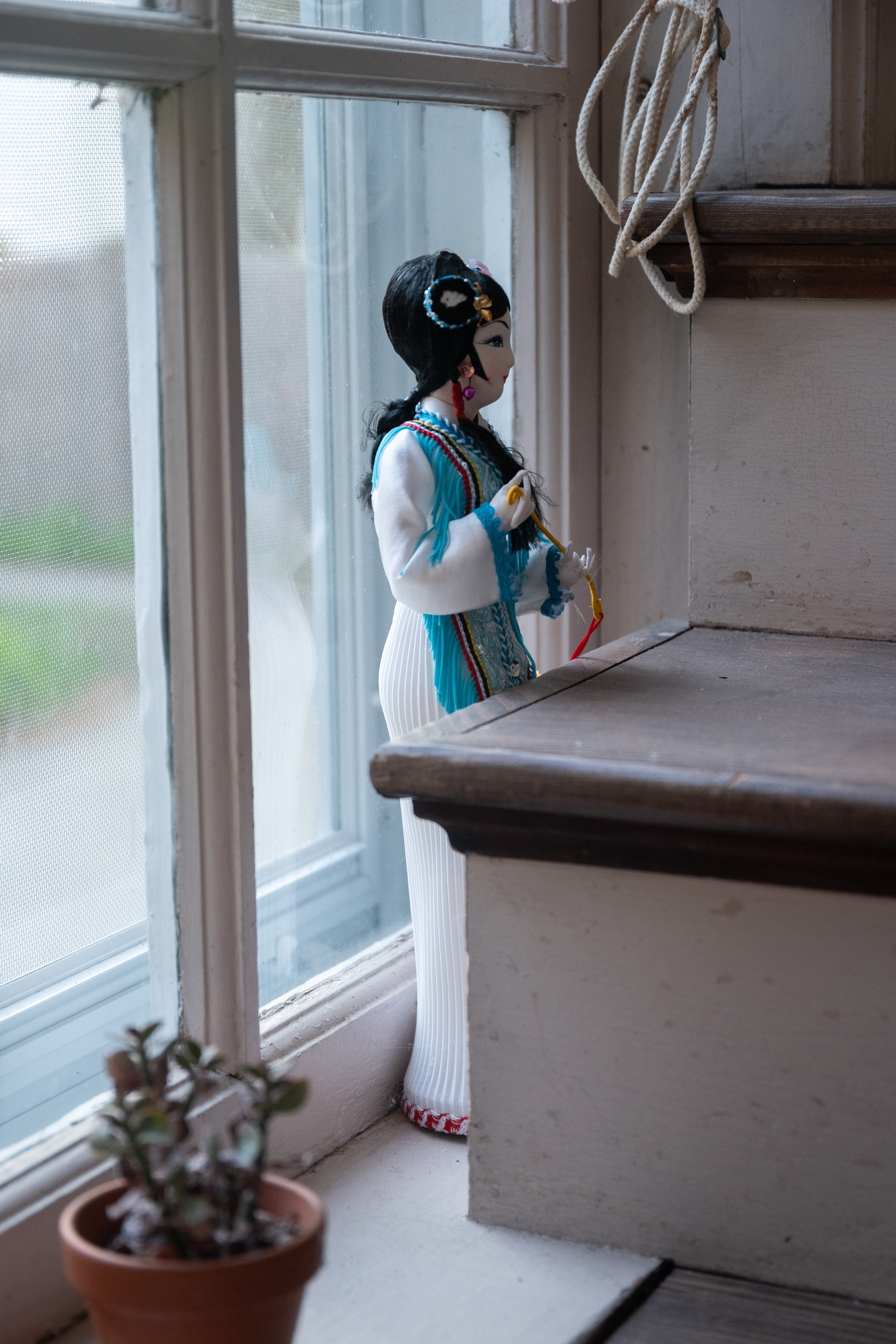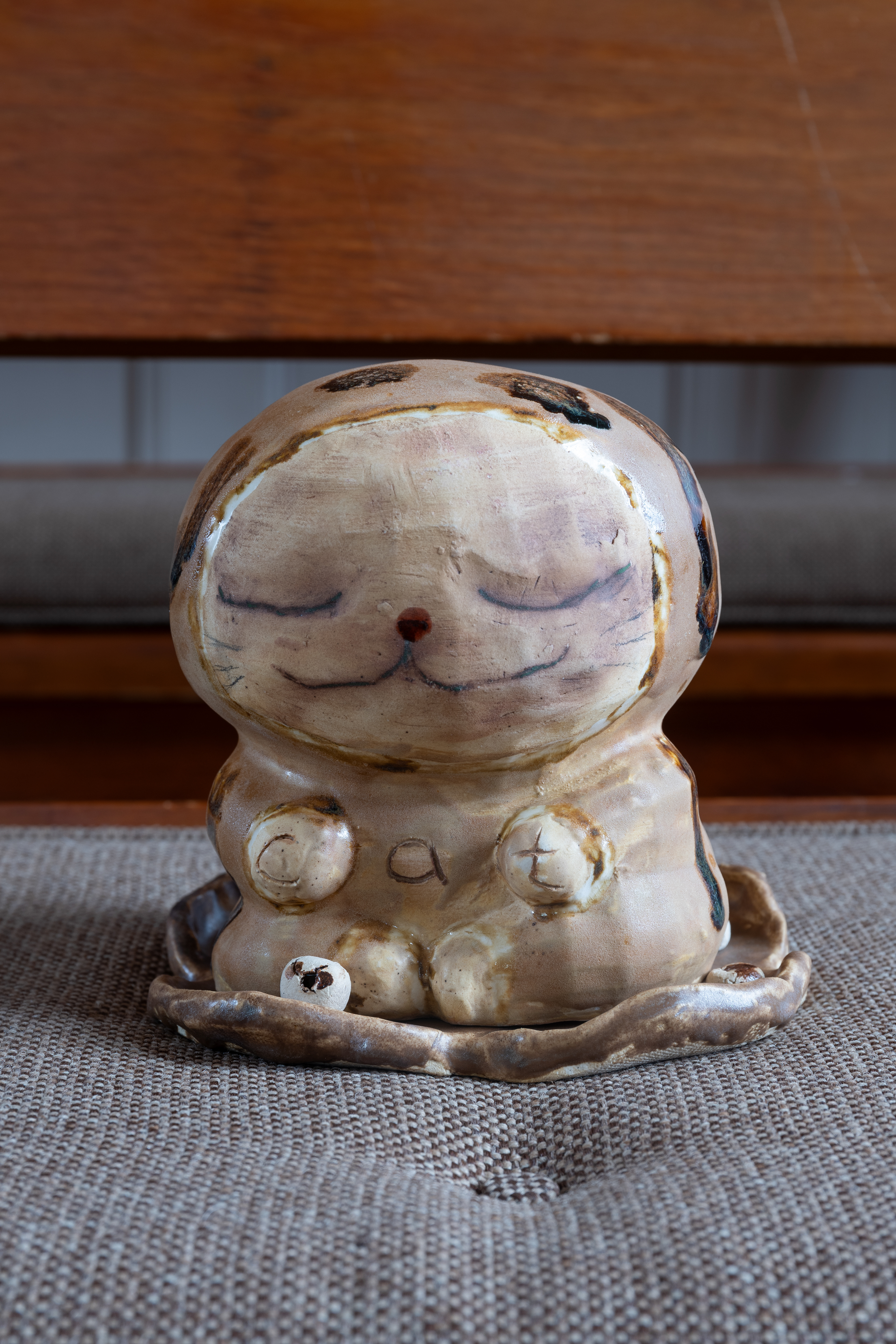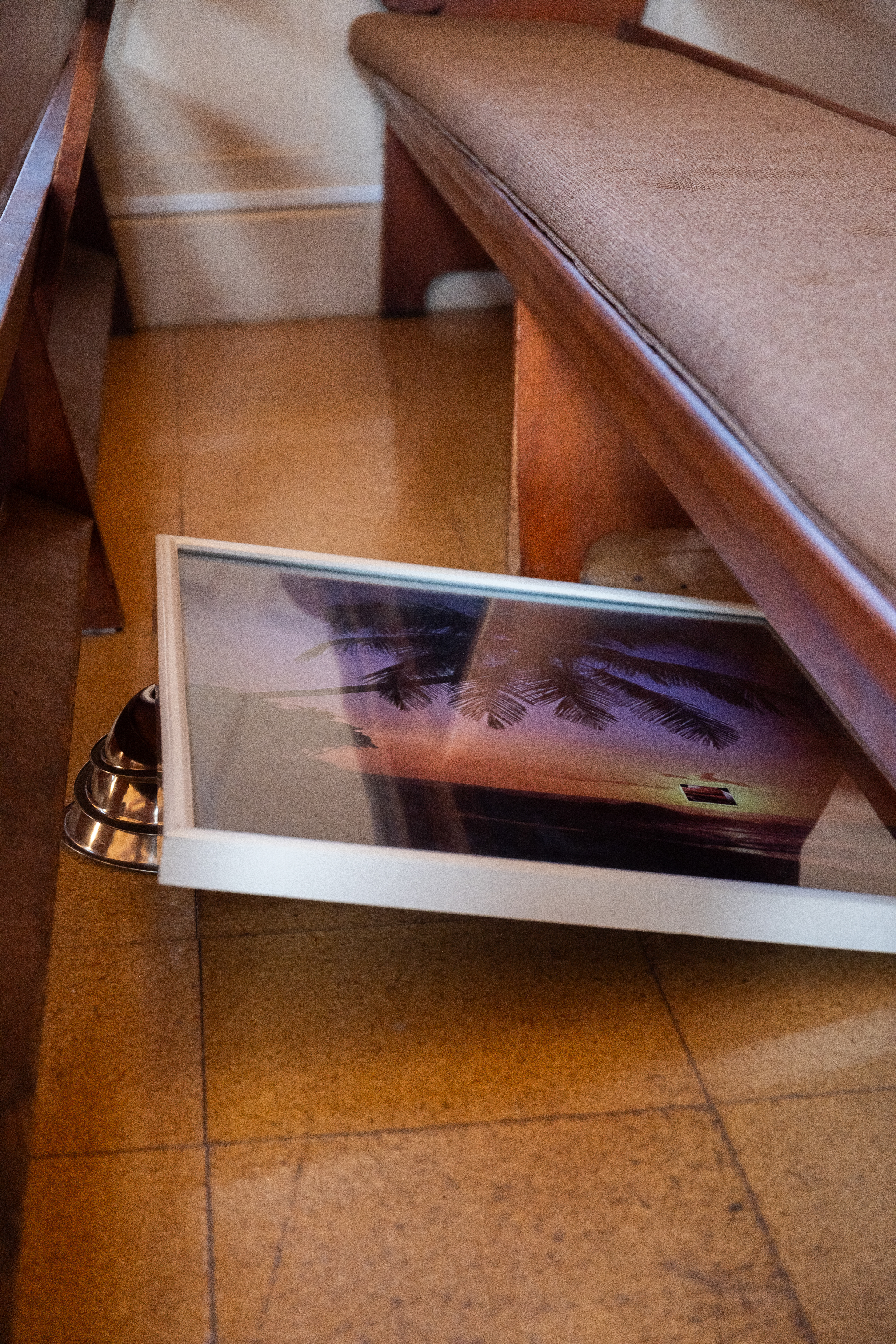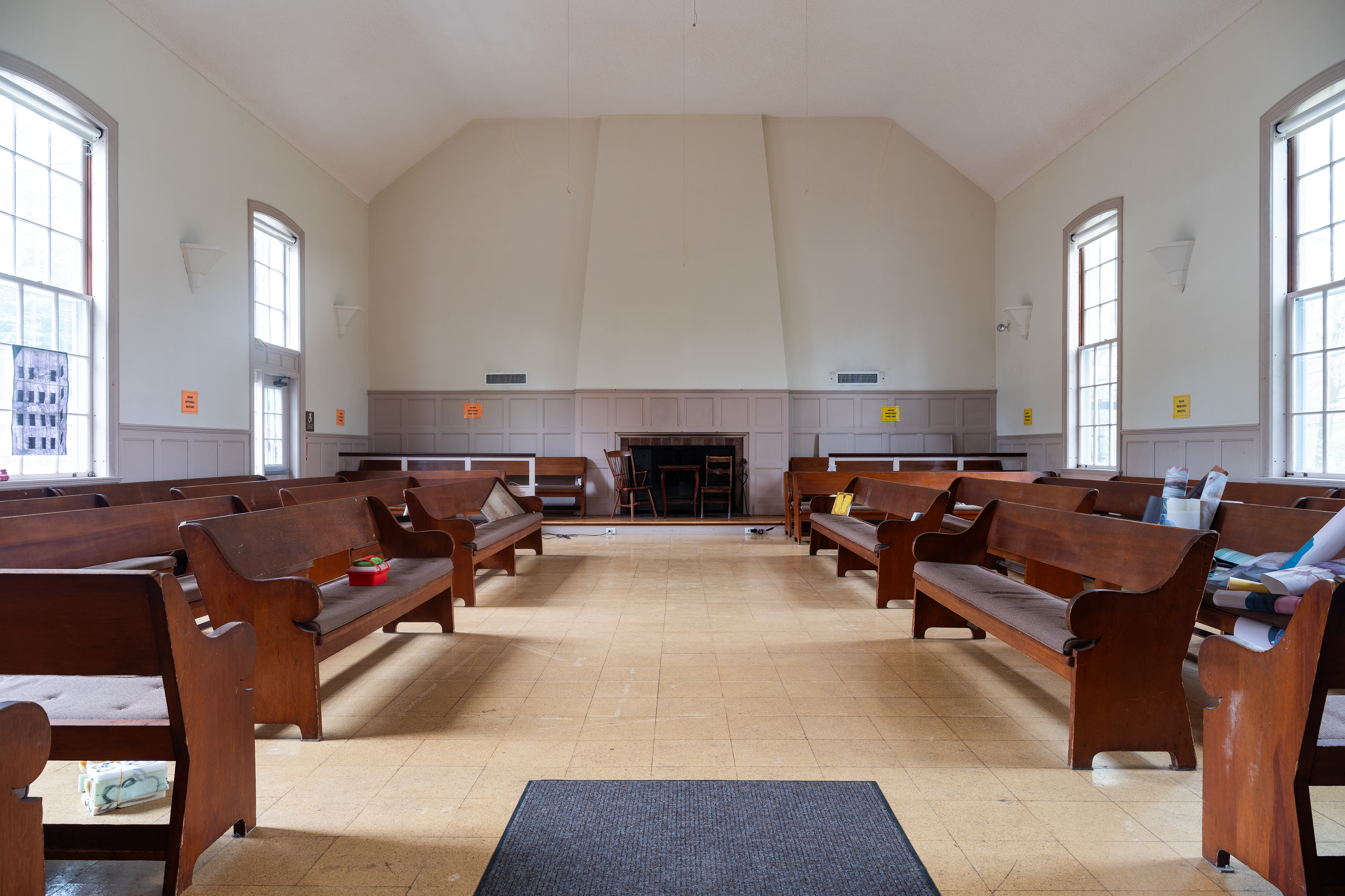 On a drizzling Saturday afternoon, Friends Meeting at Cambridge is inhabited with new beings. In between the orderly arranged pews lie a variety of objects, from glazed ceramics and painting scrolls to seemingly insignificant items like found dolls and styrofoam coolers, each of which are invited to breathe with new air and animatedness. As I entered this Quaker’s gathering place on the outskirts of Harvard Square, I was first enthralled by the expansiveness of the two-story church, with light-filled windows and views of greenery outside. I was then quickly surprised by how the curated objects inhabit a much more minor scale, with some hidden underneath or behind the benches. I was greeted by the curators / artists An Hà and Vivian Tran who offered me a program (a map with exhibited objects and where they are located) and encouraged me to explore the entirety of the meeting house. I followed my instinct to sit down and become closer to, or even a part of, this unlikely gathering, in the quiet, in the stillness, along with the gentle soundscape of the rain.