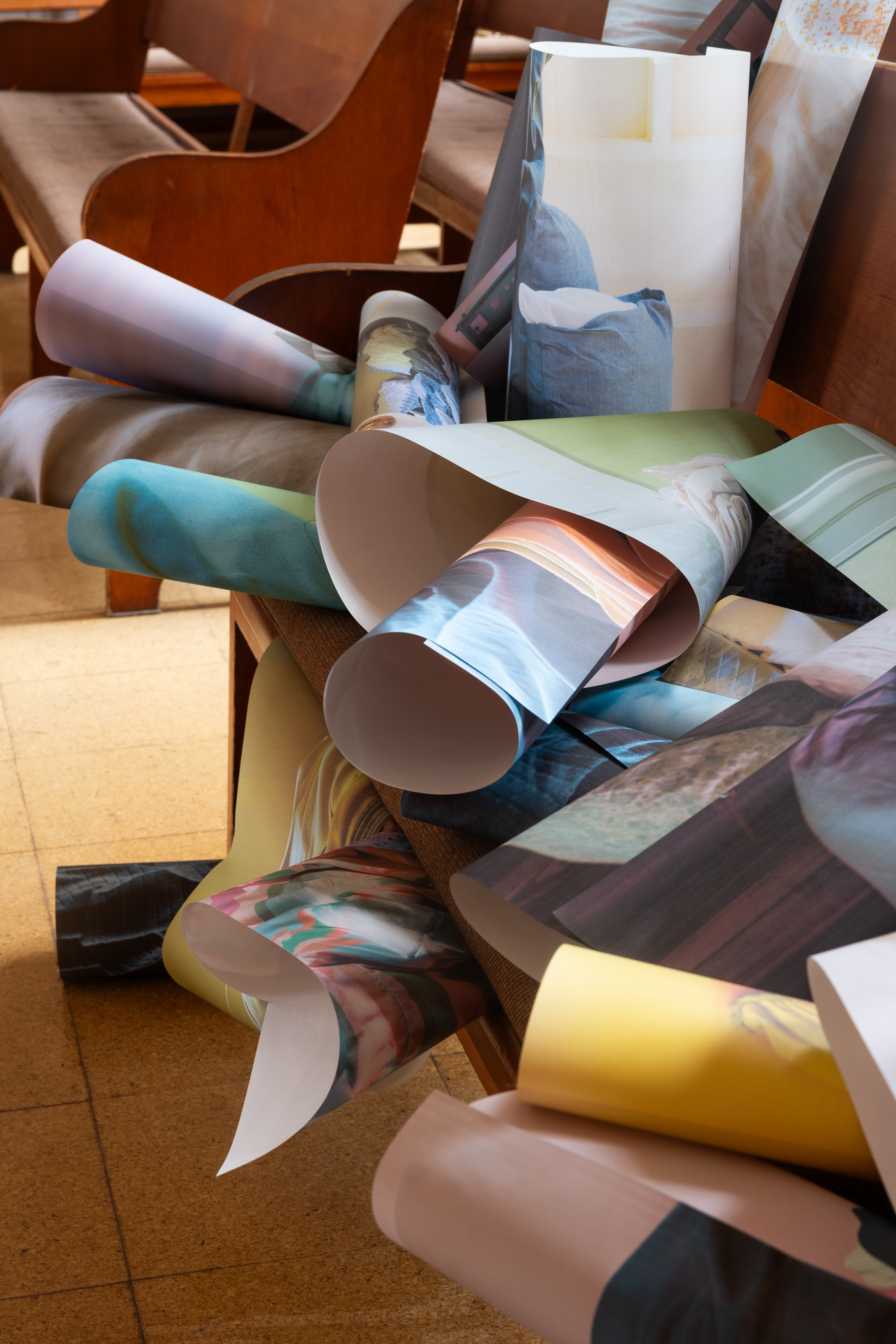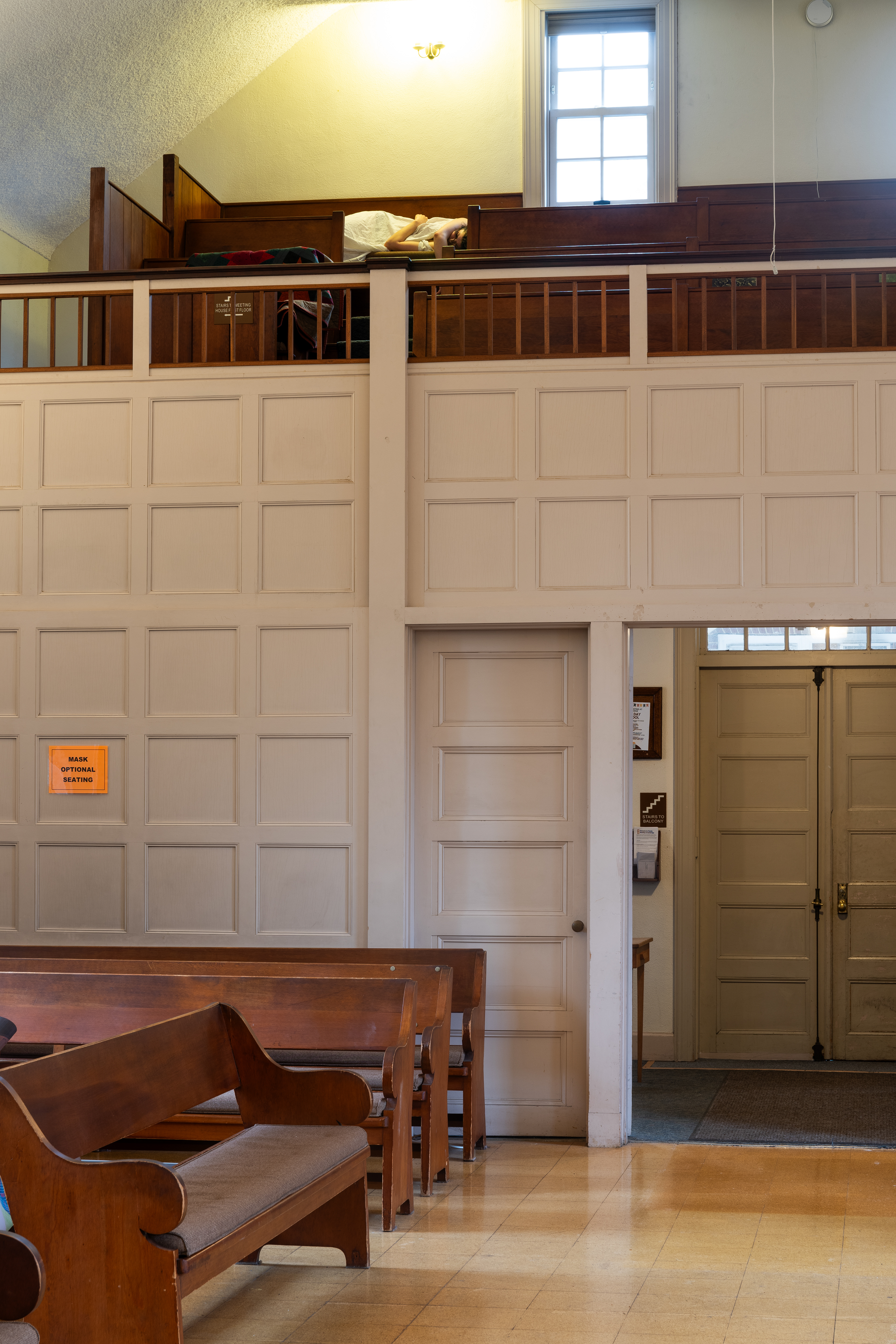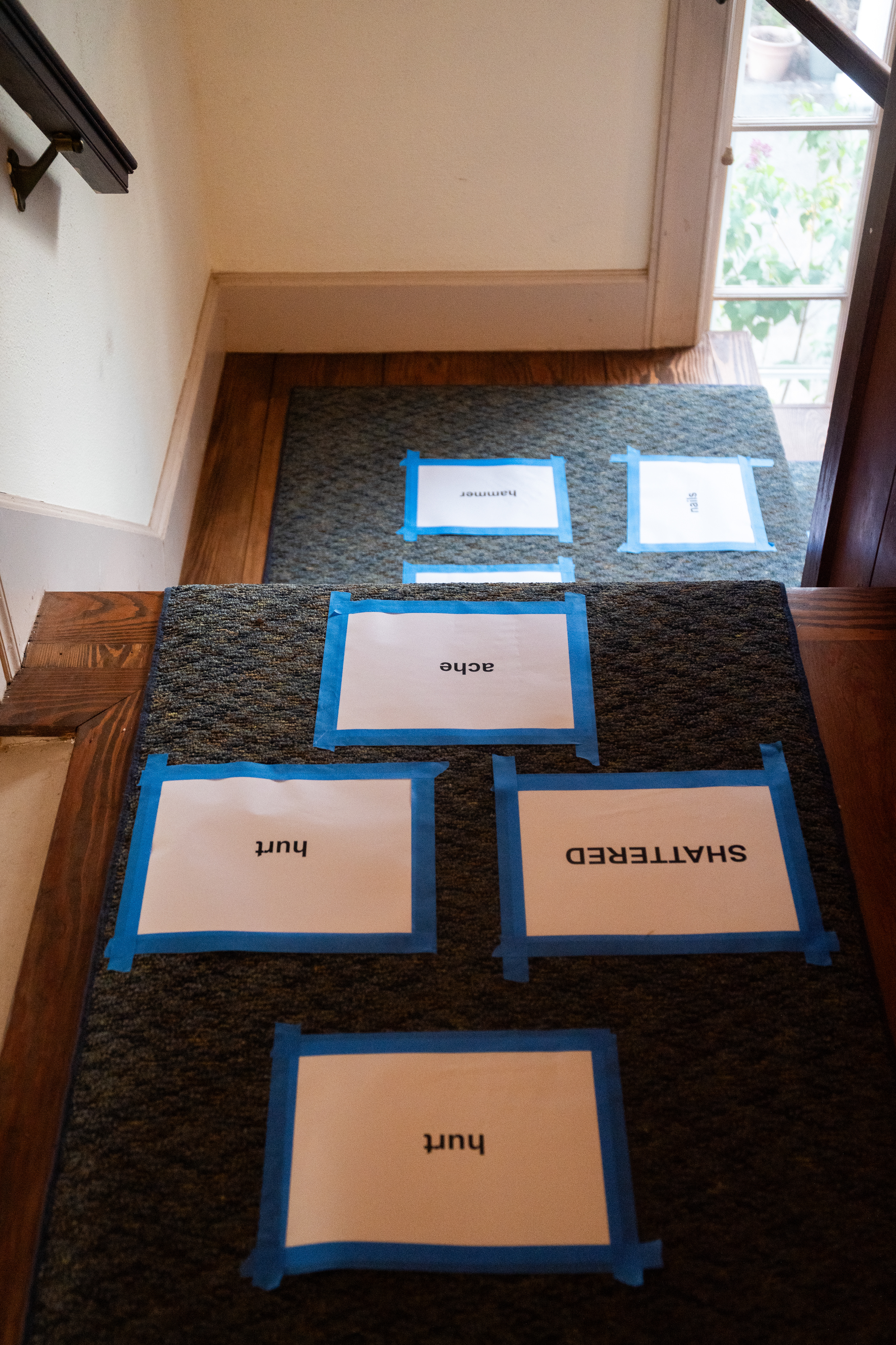 Yolanda He Yang’s slice of itchy grief teases the coexistence of loss and play in her video of a bouncing balloon ball projected on the tiny edge of a pew’s leg that is hardly noticeable. Near the space’s entrance, a staircase leading to the balcony is taped with poetry in the form of a children’s game in Yao Wang’s hopscotch #3. Words like “ache,” “hurt,” and “shattered” unfurl with each step upwards, slowing my pace with growing emotional weight. Yang and Wang’s works, albeit in different scales, require me to orient my body differently, with bent knees or a lowered head, to listen to what’s being imprinted in the architecture. The spirits of their works hold both joy and sorrow, leaving traces on the steps, under the seats, and across the atmosphere of the hall.