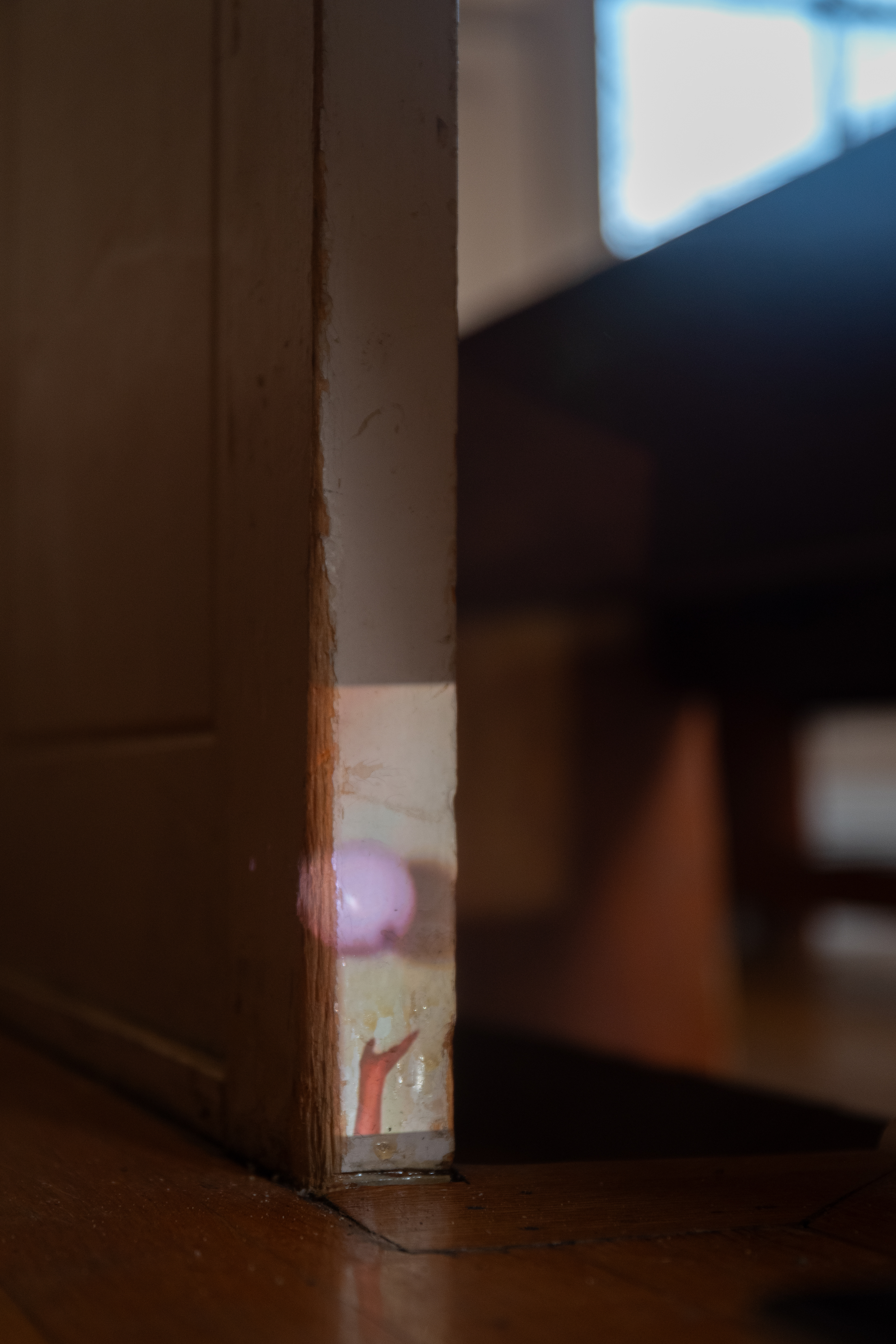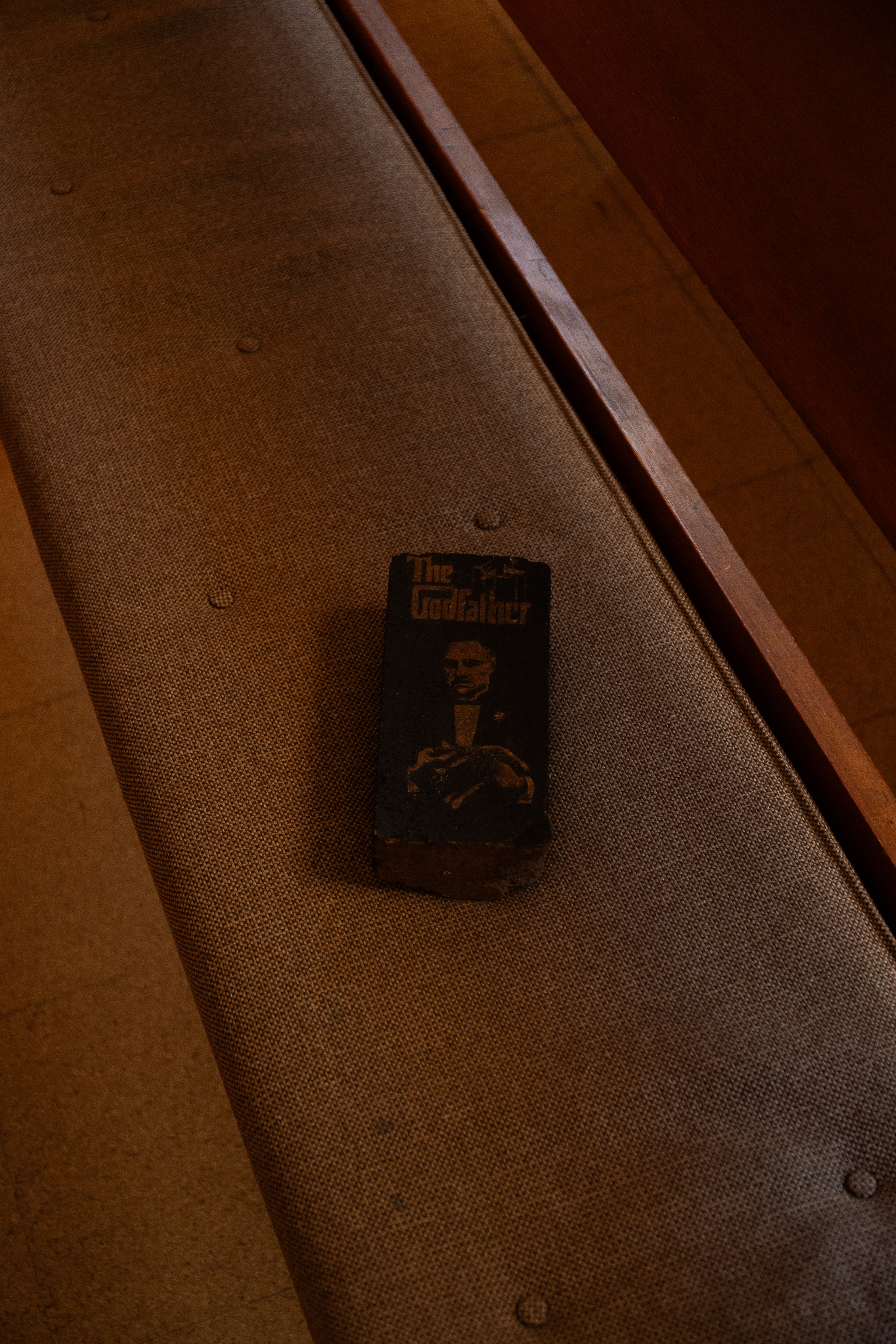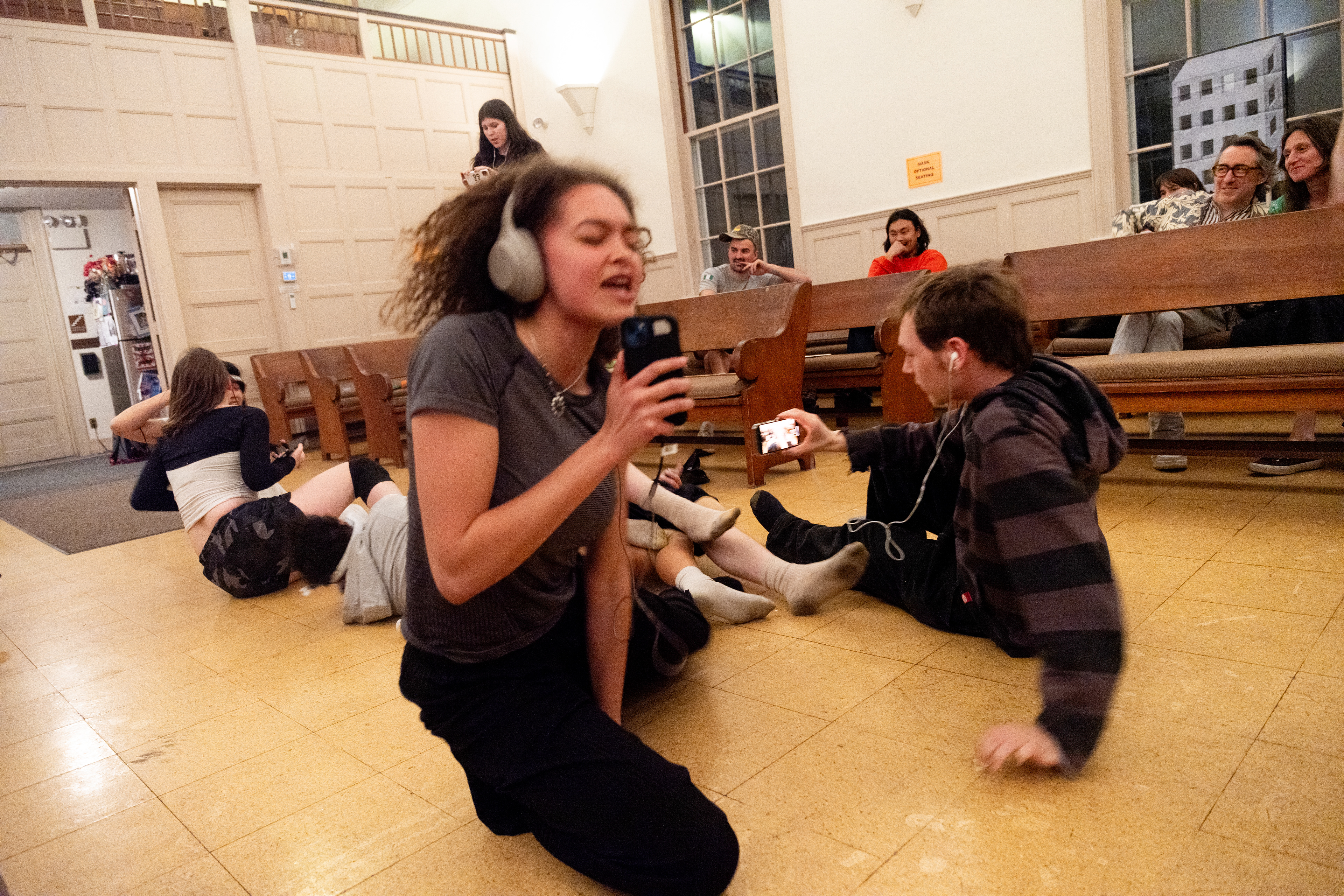 Yolanda He Yang’s slice of itchy grief teases the coexistence of loss and play in her video of a bouncing balloon ball projected on the tiny edge of a pew’s leg that is hardly noticeable. Near the space’s entrance, a staircase leading to the balcony is taped with poetry in the form of a children’s game in Yao Wang’s hopscotch #3. Words like “ache,” “hurt,” and “shattered” unfurl with each step upwards, slowing my pace with growing emotional weight. Yang and Wang’s works, albeit in different scales, require me to orient my body differently, with bent knees or a lowered head, to listen to what’s being imprinted in the architecture. The spirits of their works hold both joy and sorrow, leaving traces on the steps, under the seats, and across the atmosphere of the hall.